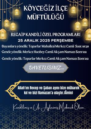 Regaib Kandili dolayısıyla Köyceğiz İlçe Müftülüğü tarafından Perşembe günü saat 10:30 da Toparlar Mahallesi Merkez Camiinde bayan kardeşlerimize yönelik kandil özel programı yapılacak olup akşam namazından sonra da tüm camilerimizde olduğu gibi Merkez Hacıbey Camii ve Toparlar Merkez Camiinde Kandil özel programı yapılacaktır.