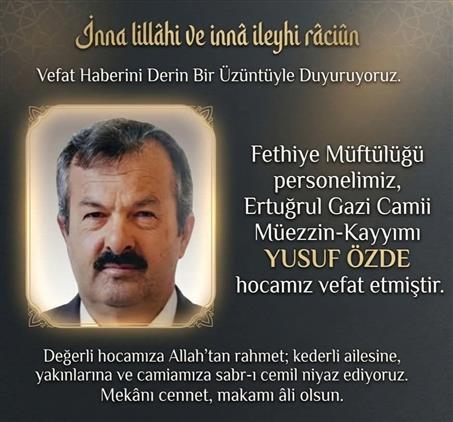Meslektaşımız, güzel insan, sessiz ve mütevaziliği ile örnek din görevlisi Fethiye Müftülüğü Ertuğrulgazi Camii Müezzin-Kayyımı Yusuf Özde hocamız talihsiz bir kaza sonucı vefat etmiştir.