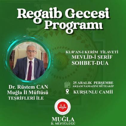 Üç ayların müjdecisi olan Regâib Gecesi, Muğla’da manevi bir atmosfer içerisinde idrak edildi. Merkez Kurşunlu Camii başta olmak üzere 13 ilçede binin üzerinde camide, üç ayların gelişi ve ilk perşembeyi cumaya bağlayan gece dolayısıyla düzenlenen programlara vatandaşlar yoğun ilgi gösterdi.